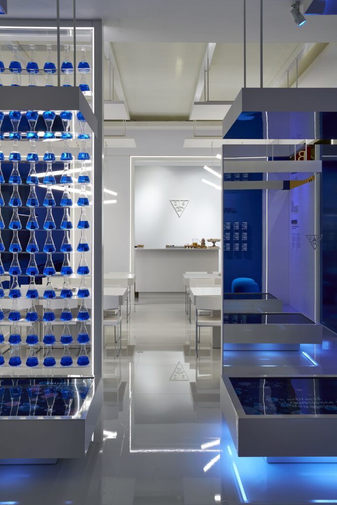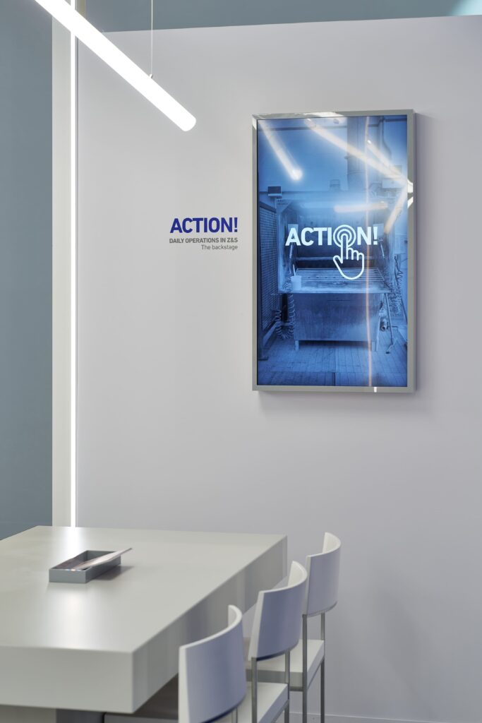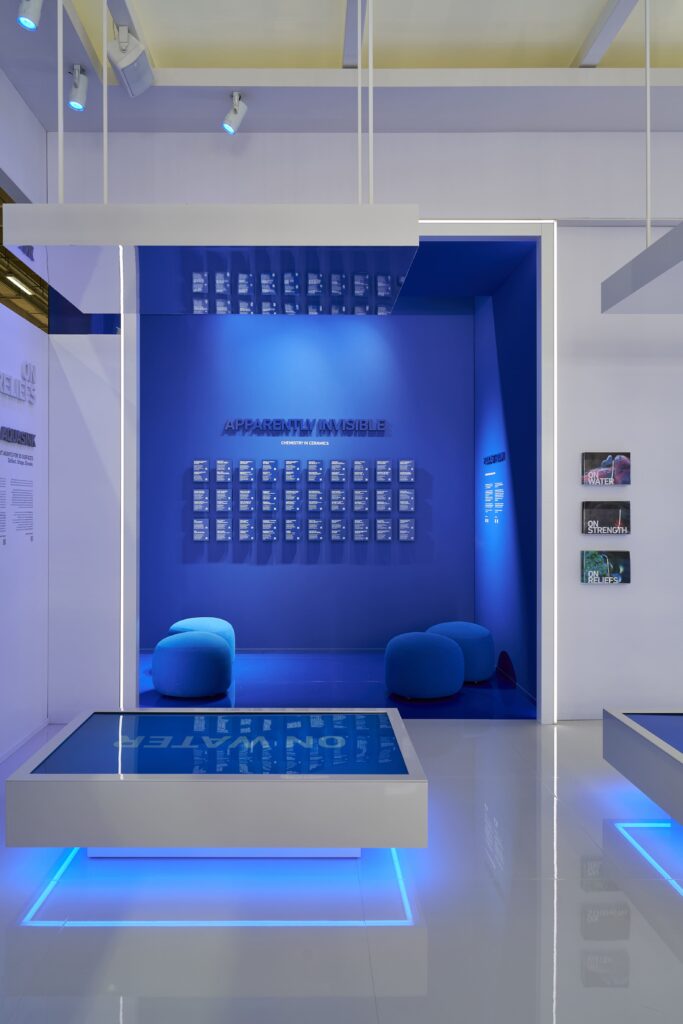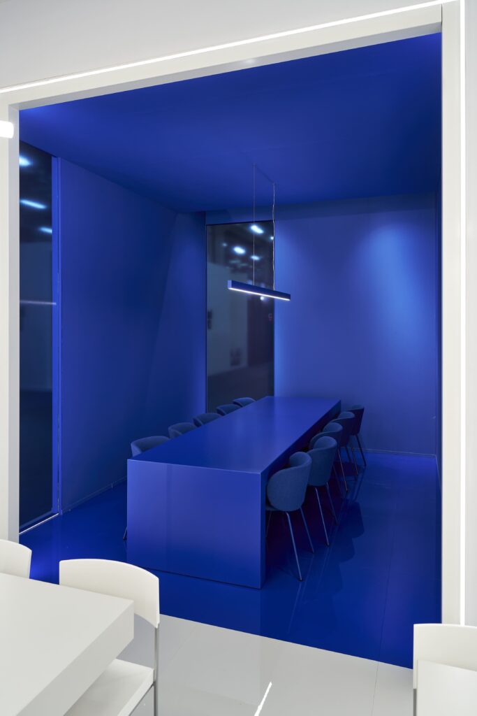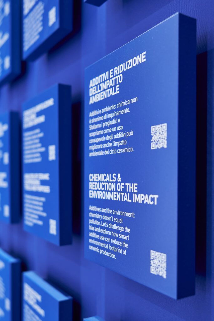 Lo spazio espositivo è stato pensato all’insegna del rigore e della chiarezza. Linee pulite, prospettive nette e una palette cromatica volutamente contenuta — il bianco, abbinato al blu istituzionale dell’azienda — hanno definito un ambiente sobrio ed essenziale.