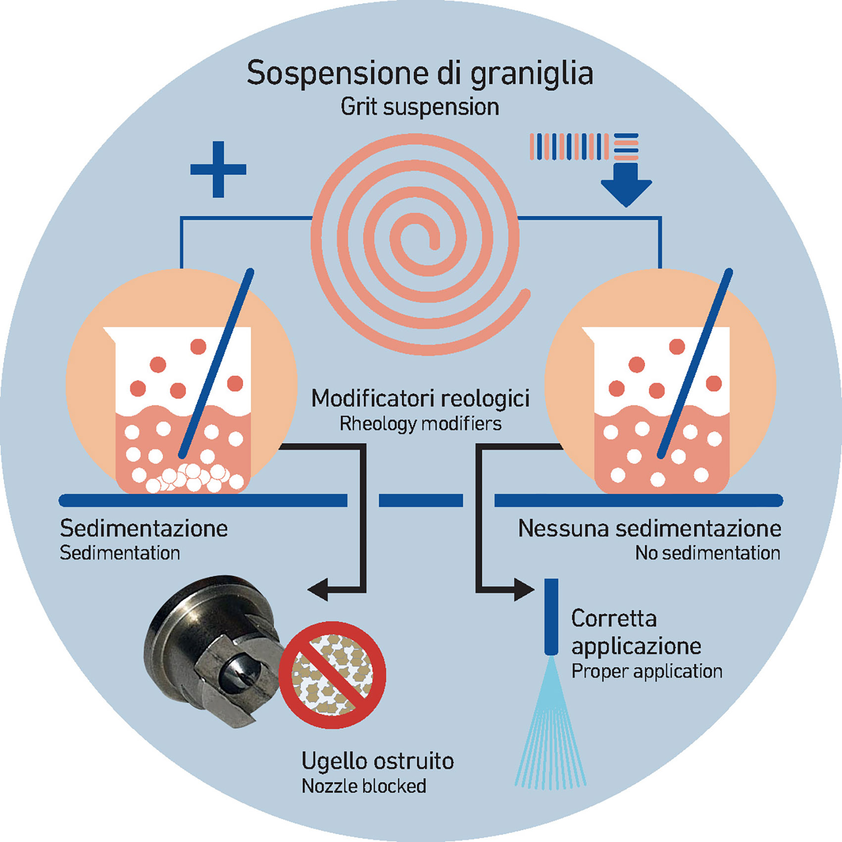 Once they have been wet, grit’s particle can freely move inside the suspension and slip on each other, avoiding the clogging of the nozzles.
