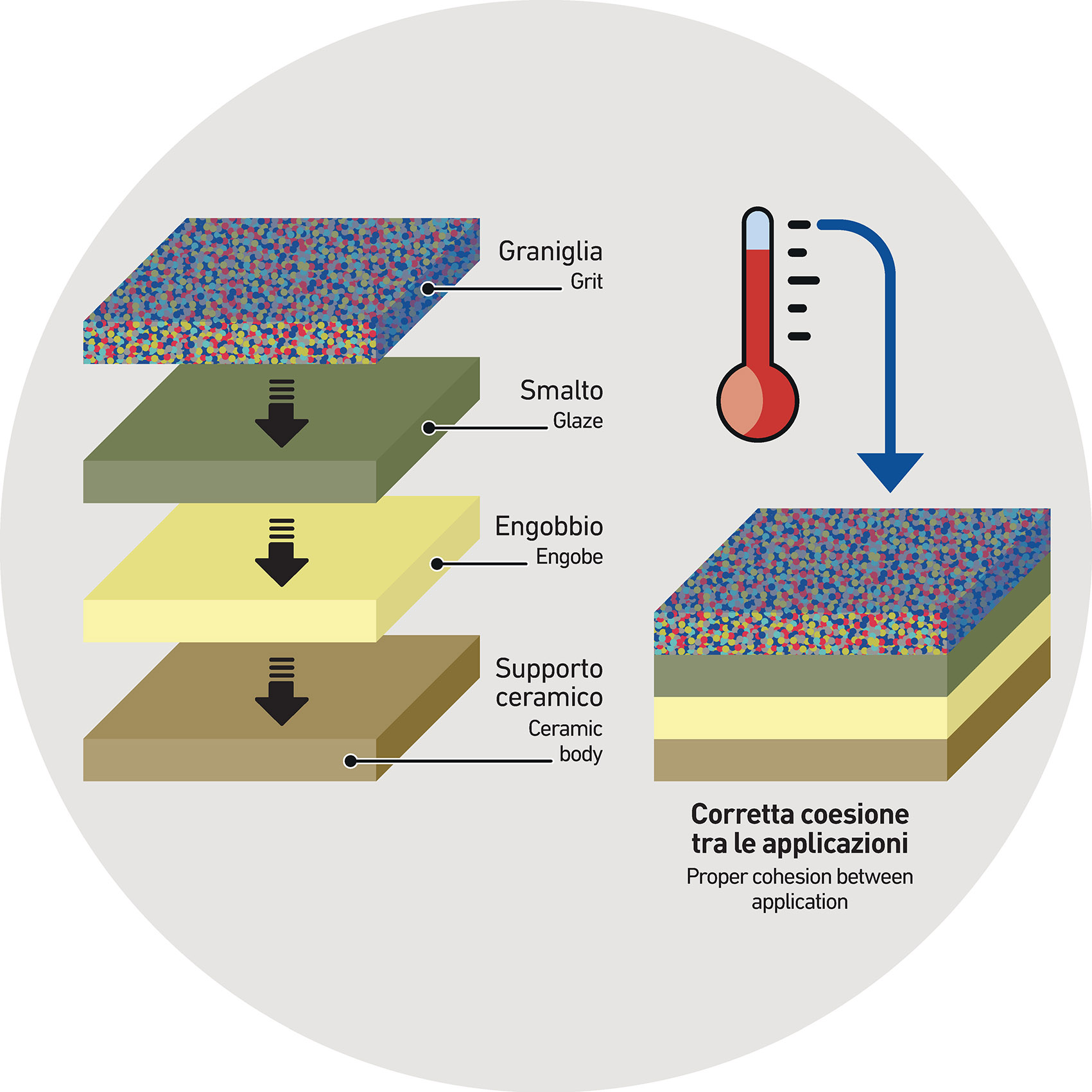 The evaporation process promoted by the high temperature of the tile, makes the surface dry and therefore ready to properly receive the subsequent applications since the presence of excessive water instead of promoting a proper cohesion between the applications discharged on the tile surface could sometimes lead to a mix – or a blending of the layers And this, obviously, is a serious problem.