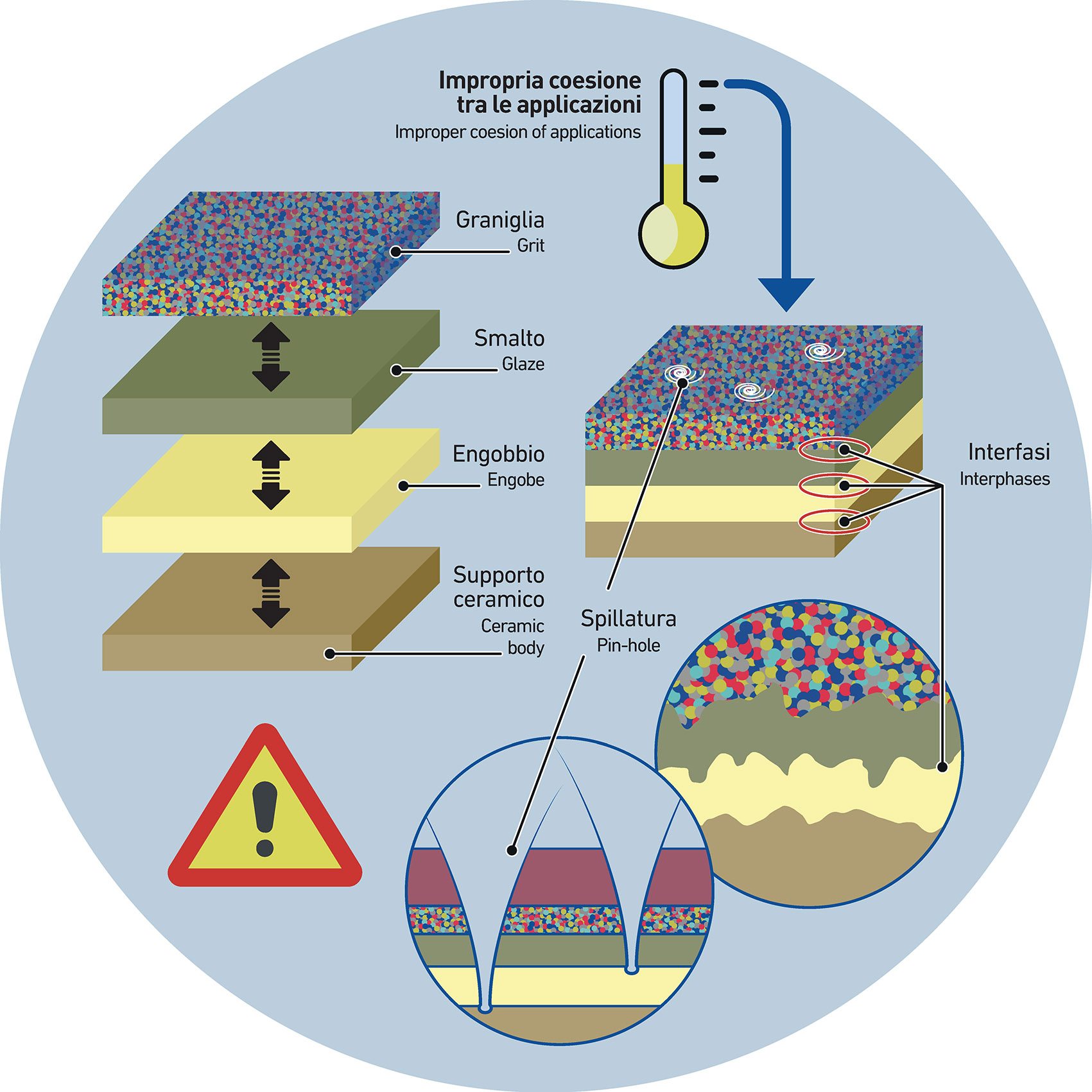 Pinholes can be also promoted by an improper balance between the materials involved in the production process. We are talking about the relation between engobe, grit and glaze applied at the end of all processes as a protection covering. These three, are usually chosen to provide the glaze with the best conditions in terms of compatibility, uniformity as well as fusibility during the firing process.