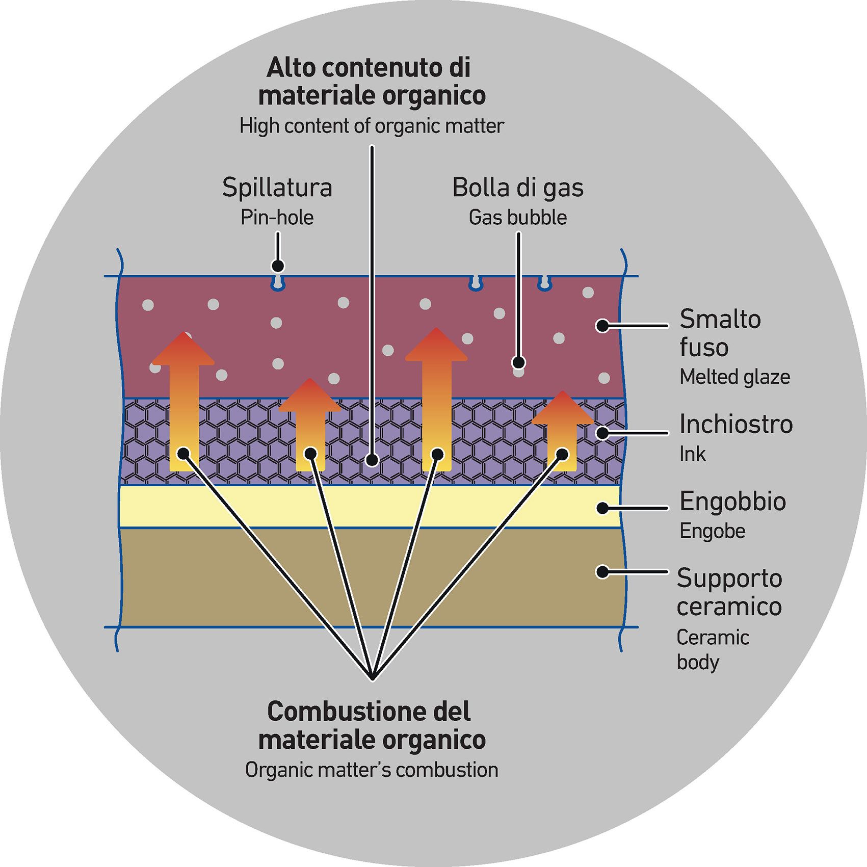 It happens that some of the organic matter of the ink may not reach the burning stage before the melting process of the glaze (or grit). The problem is that the combustion of the ink’s organic matter keeps going even after the melting process of the glaze and this means that some of the organic matter is no more able to leave the tile, forming gas bubbles that remain trapped inside the glaze or inside the grit.