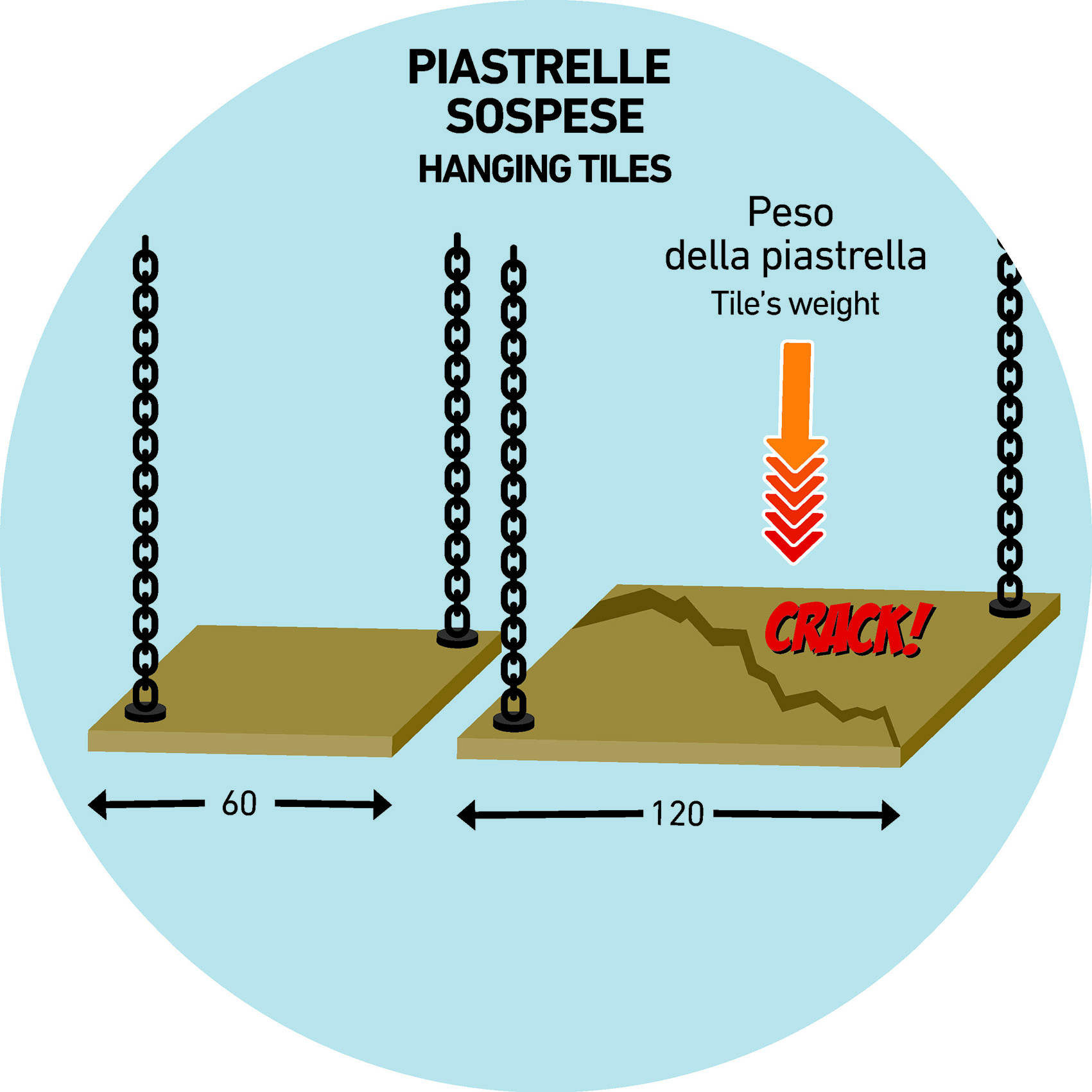 Let’s take two different tiles with the same thickness (60×60 and 120×120) and then let’s try to keep them suspended by hanging them at their opposite edges, or corners. What happens?