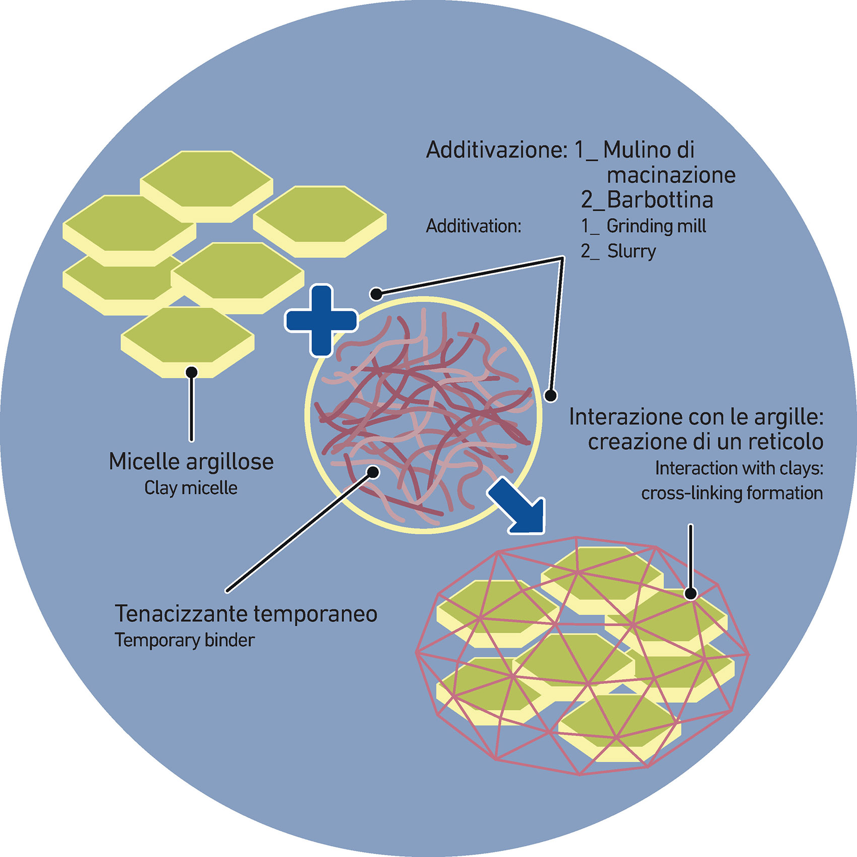 A molecule of temporary binder contains functional groups (parts of the molecule able to chemically interact with other materials) able to form a lattice or a cross-linking both between the micelle and the hard inorganic raw materials. It basically links together the inorganic particles, increasing the resistance of the tiles after drying process.