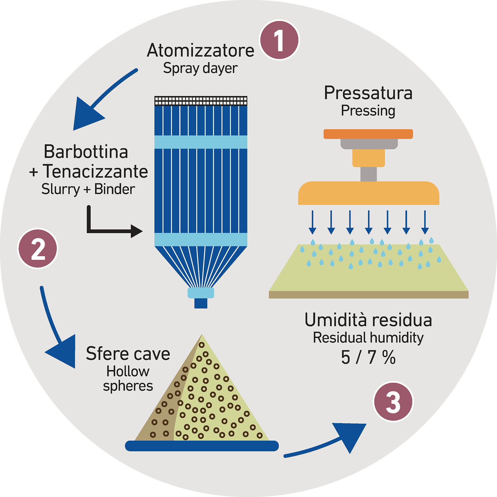 The slurry, once it has reached the proper features, enters the atomizers where the water undergoes to a strong and violent evaporation process that leads to the formation of granules (hollow spheres) marked by a residual humidity that normally ranges from 5% to 7%.
