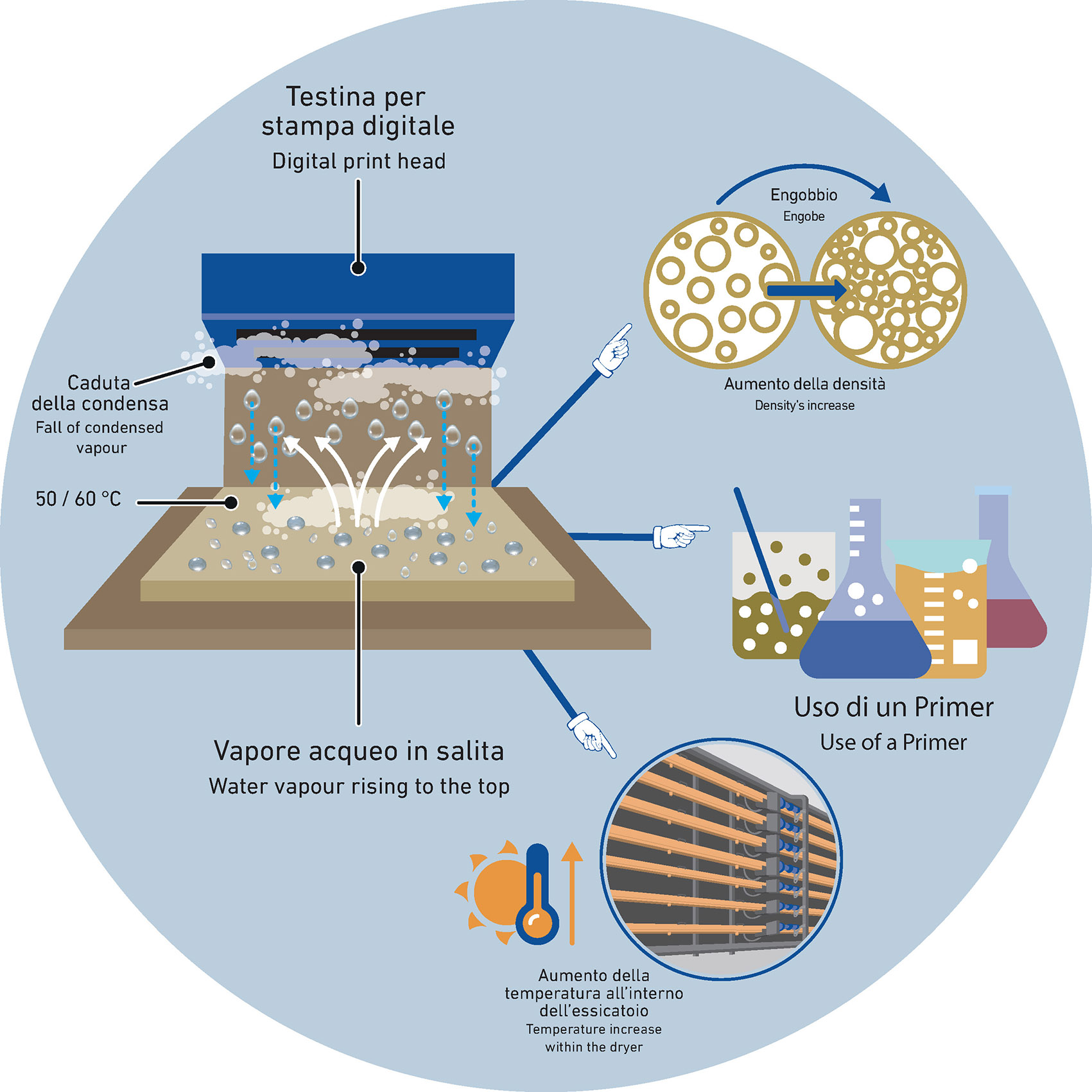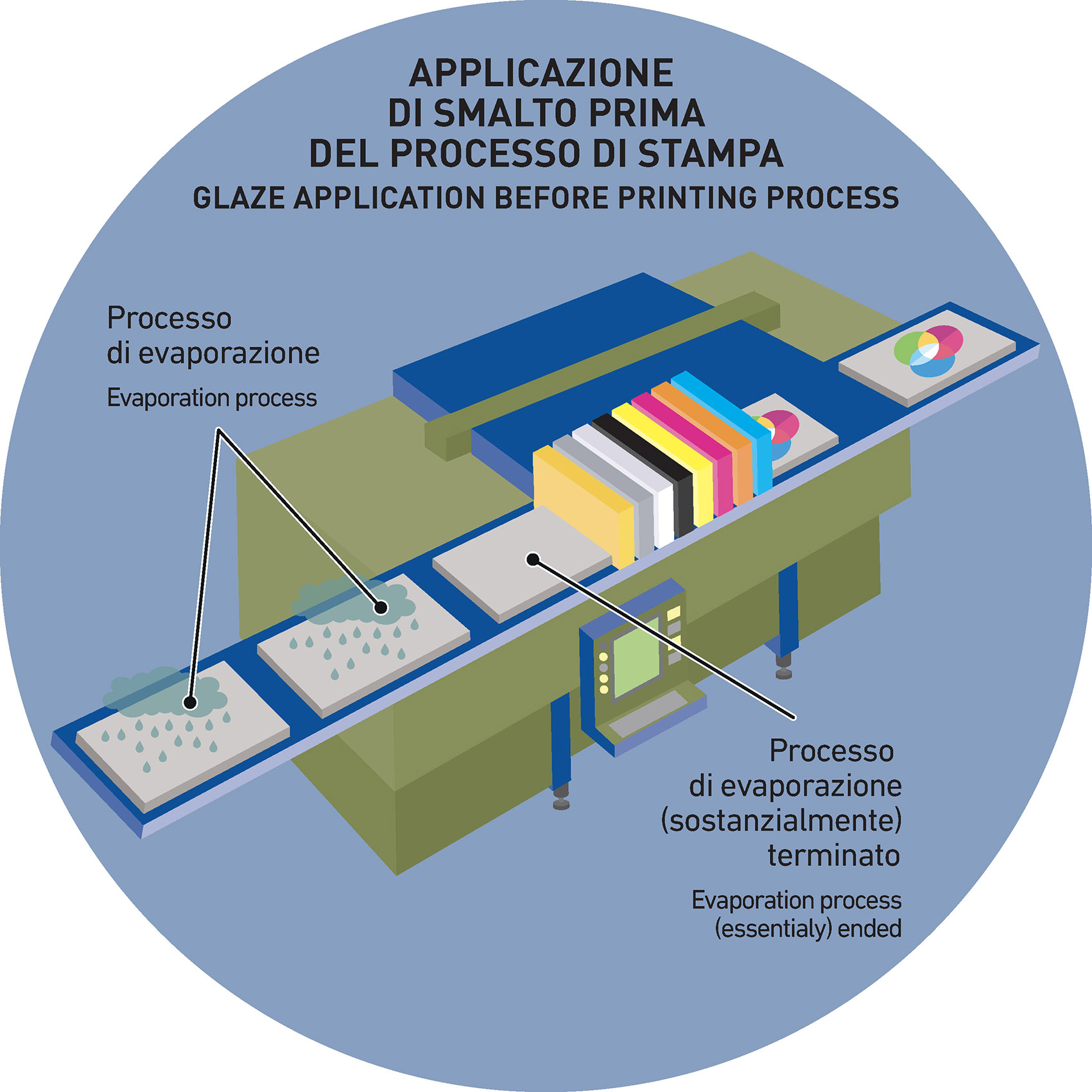 In general, along the glazing line, it is unusual that a glaze applied on the ceramic surface reaches the digital printing machine when is still overly wet: in other words, the water amount of the glaze suspension applied before the printing process, tends to largely evaporate before the raw tile has arrived under the printheads that discharge the inks.