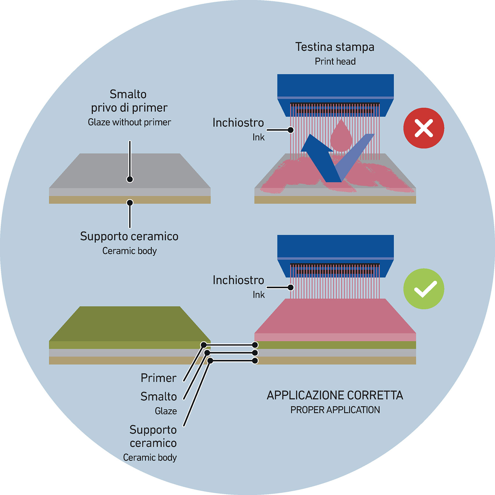 To avoid or reduce the problem, it is required the addition of a proper PRIMER, able to create a reticulation between the glaze’s particles, reducing the penetration both of ink and solvents.