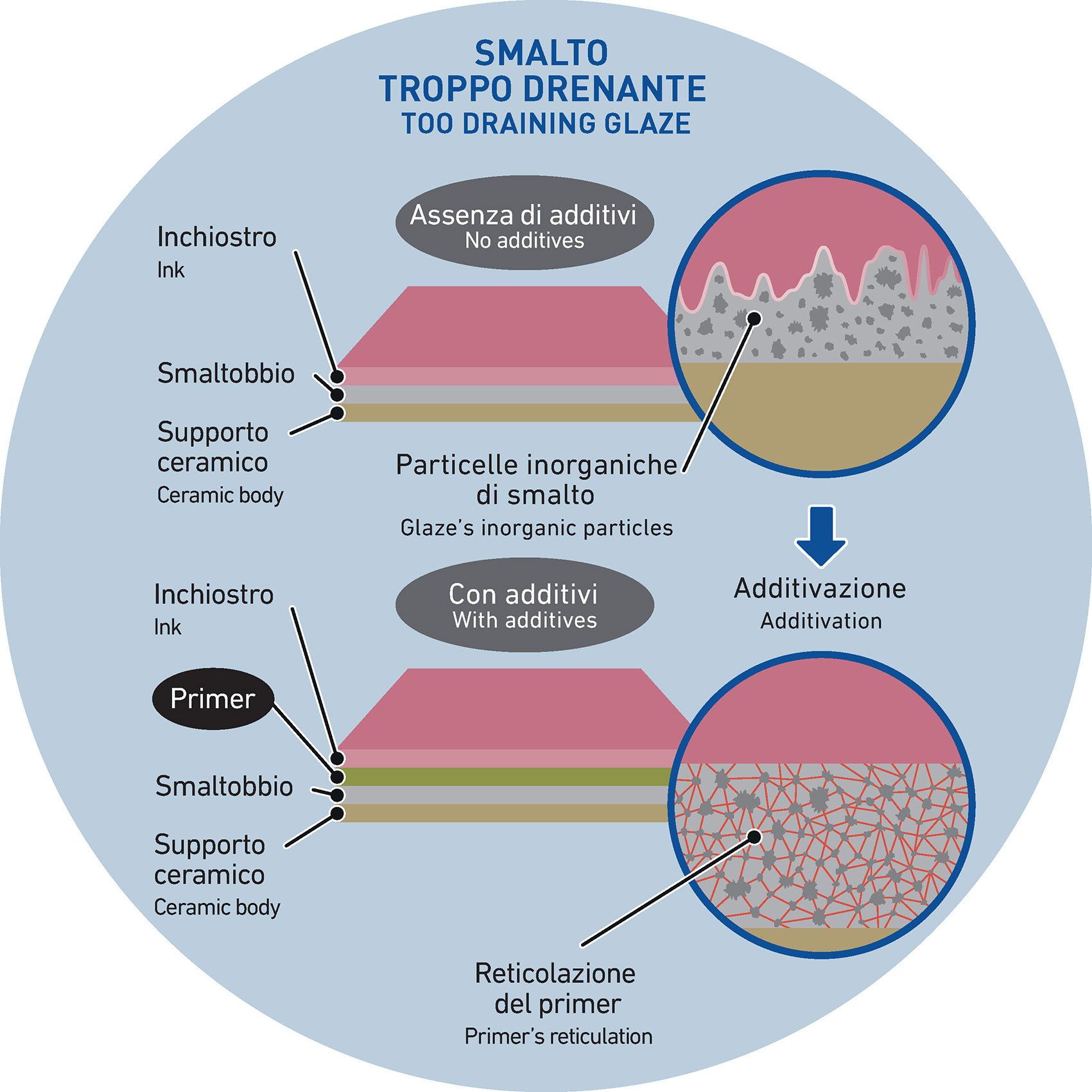 The main target is the formulation of chemicals able to promote the best rheological conditions for the developing of a more open reticulation within the glaze, allowing the ink to sink through the superficial layer and so improving the drainage.