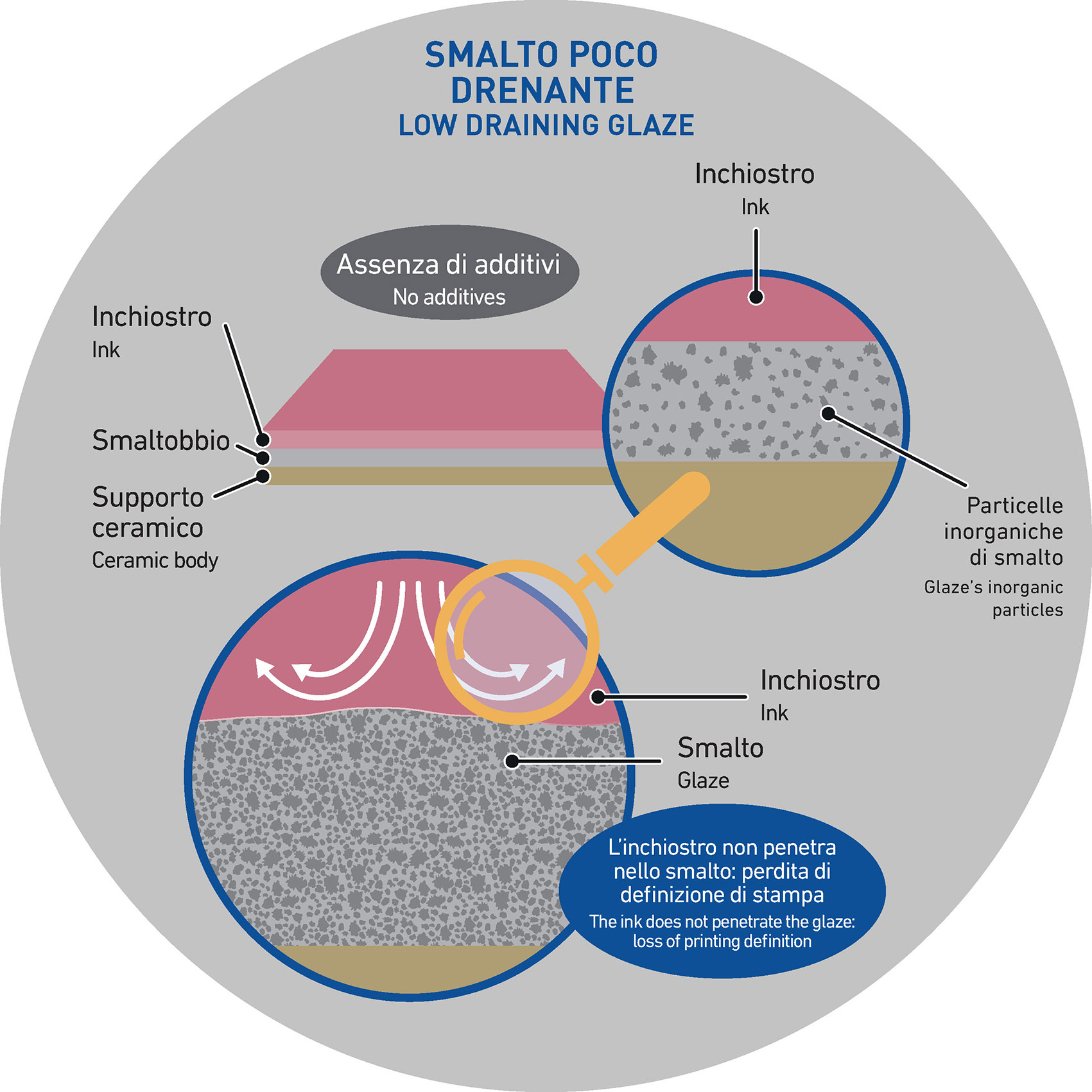 Despite this scenario is unusual, in all these cases the glaze (that is usually not very plastic) is marked by the presence of many inorganic raw materials that, despite being cohesive, are “distant”, allowing the drainage/sinking of the ink.