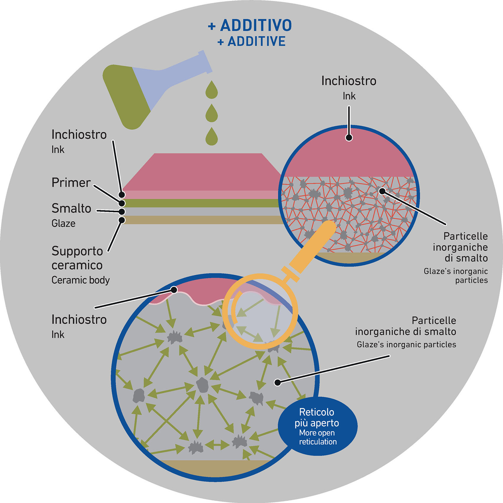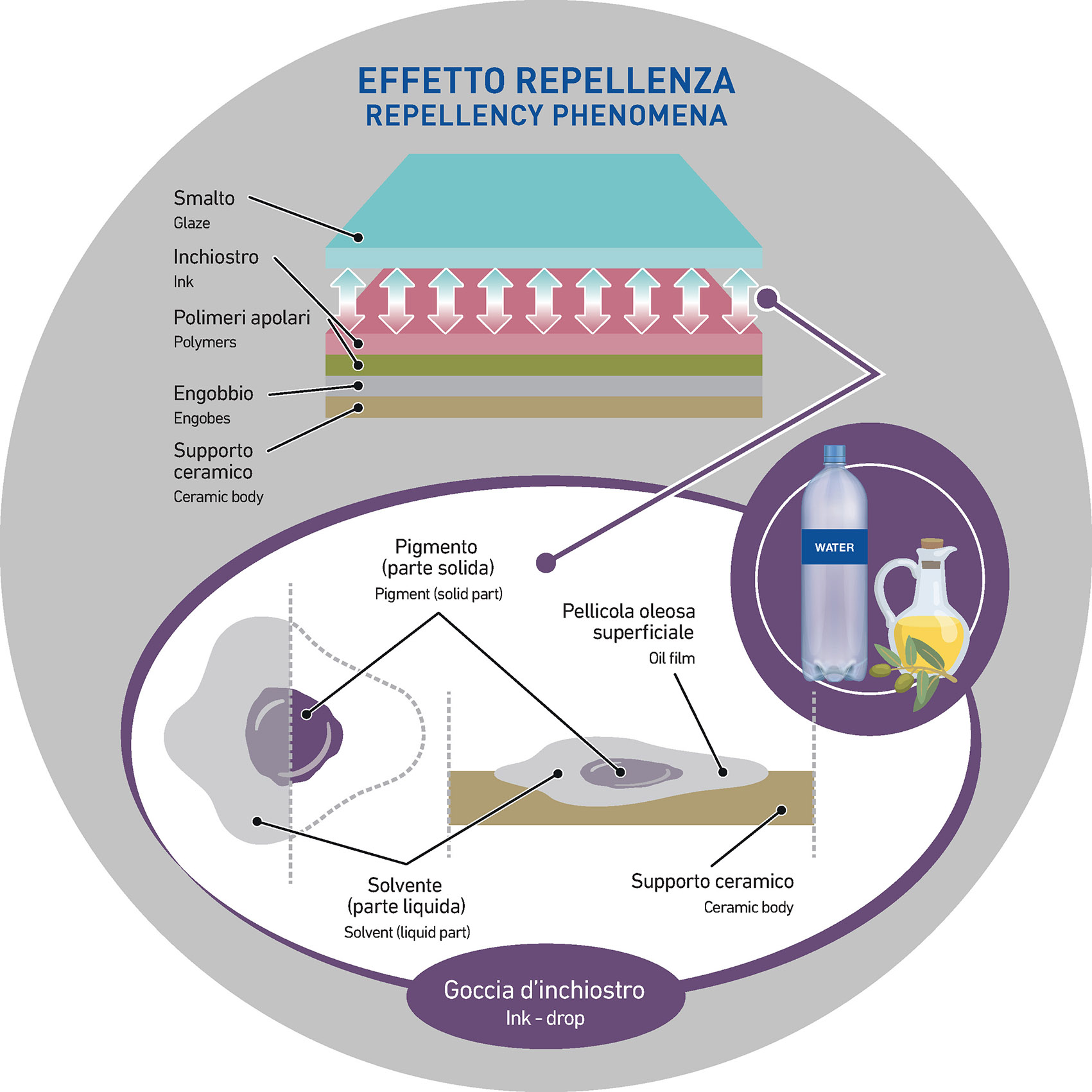 In ceramics, the lack of interaction between inks and glaze leads to the same repellency phenomenon that, in general, turns into an improper glaze leveling on the raw ceramic support.