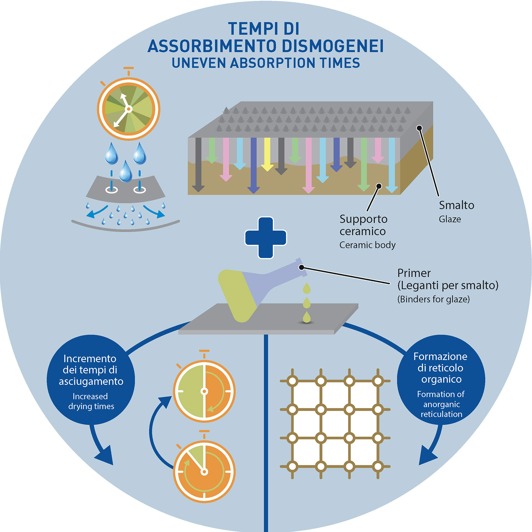 In some cases, raw tiles (especially those with textured surfaces) can unevenly absorb the ink, forcing ceramic producers to use specific primers (binders or wetting agents) able to uniform the process.