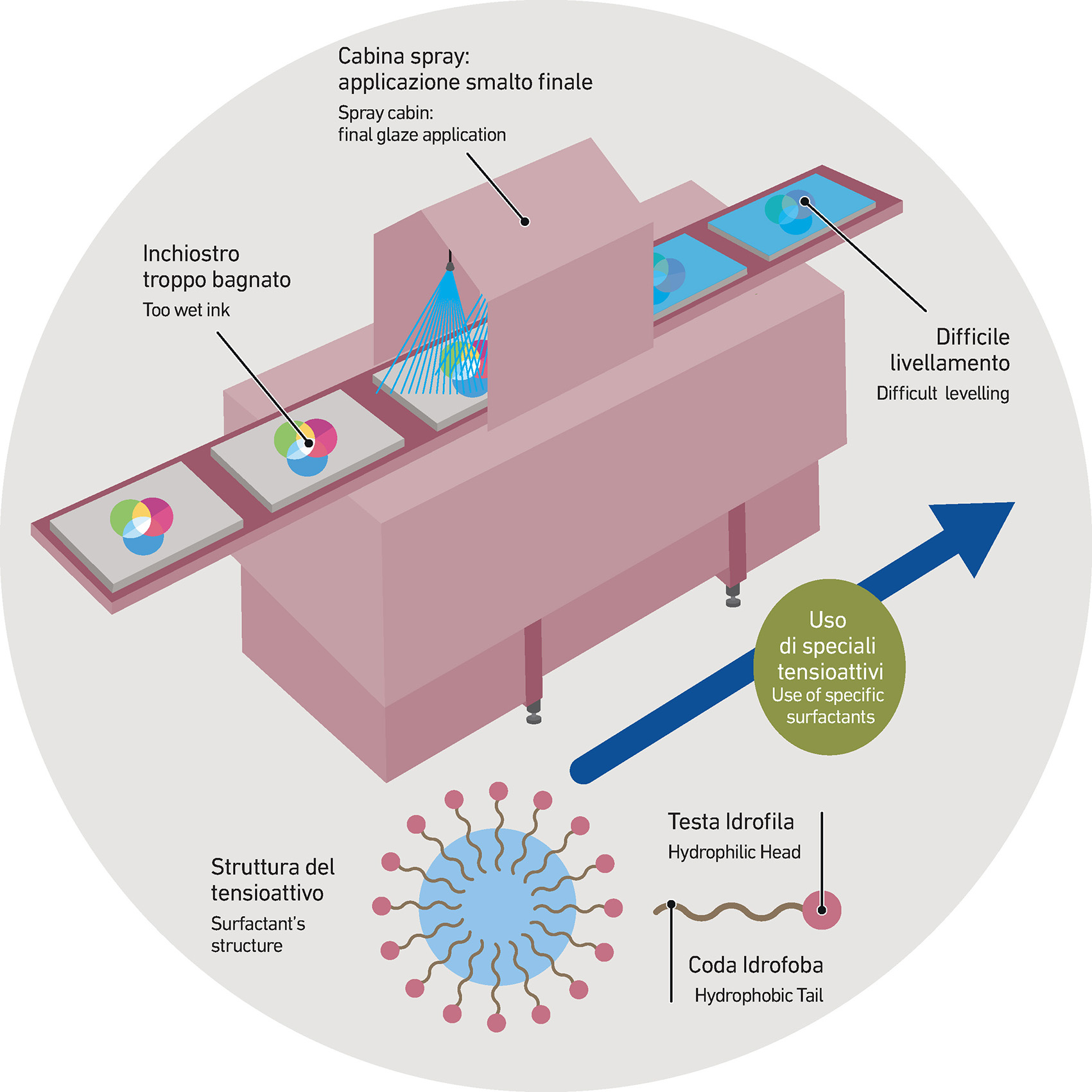 Once again, the high surface tension of the aqueous system is involved and it must be reduced by using specific chemicals so that the glaze that is discharged on the raw tile can fully wet the oily surface of the ink.
