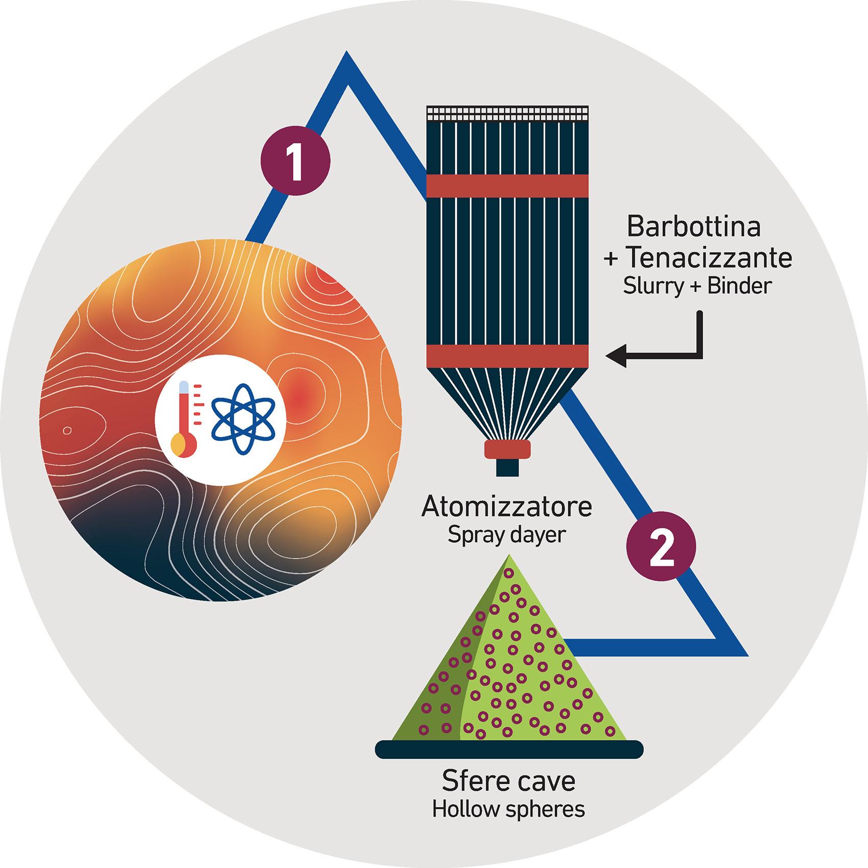After the milling process, the slurry enters the atomizer to lose by evaporation the liquid part of the suspension (except for a low amount of residual humidity that is about 5/7%), producing the atomized ceramic powder that, under the weight of the press, will form the raw ceramic tile.
