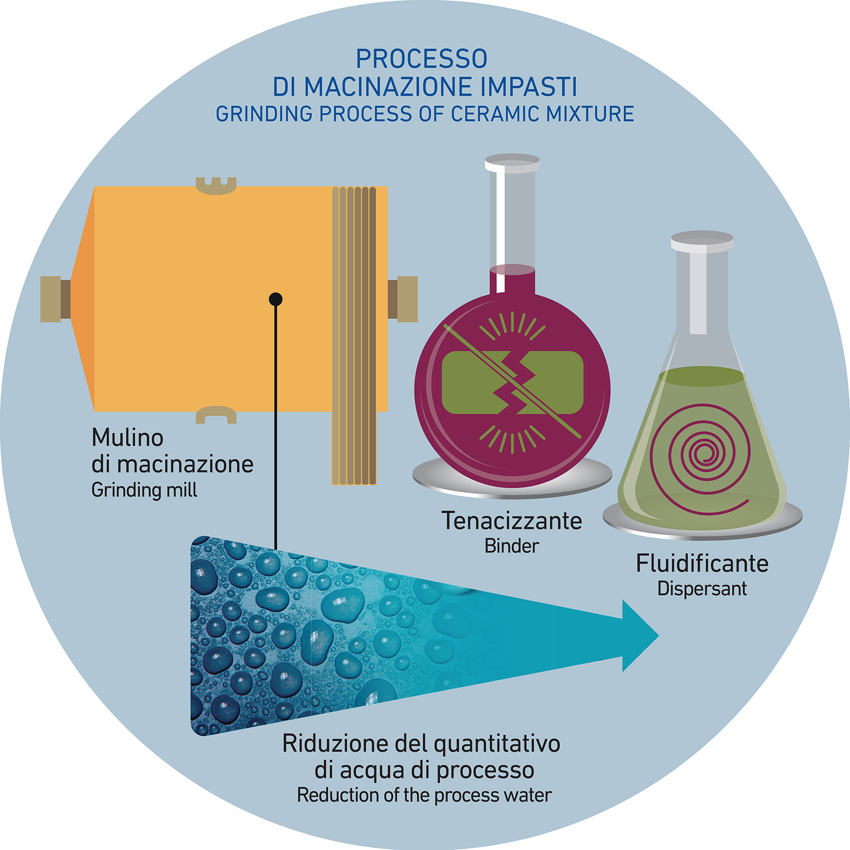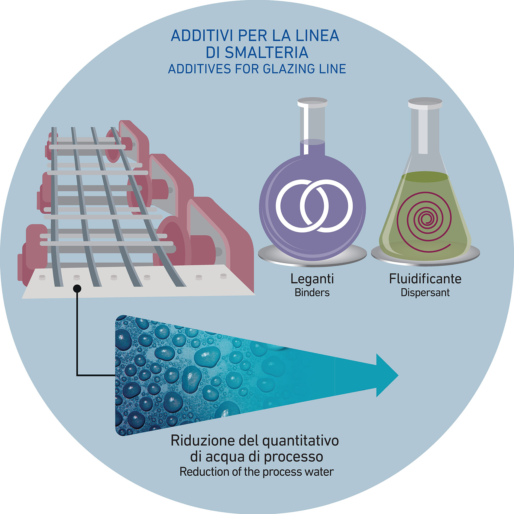 The use of proper DISPERSANTS – specifically studied to provide the slurry with the right viscosity values – allows you to correctly develop the production process and to reduce the water amount in the suspension: their fluidifying action, in other words, is synonymous with energy reduction. The latter can also be improved thanks to the use of TEMPORARY BINDERS.