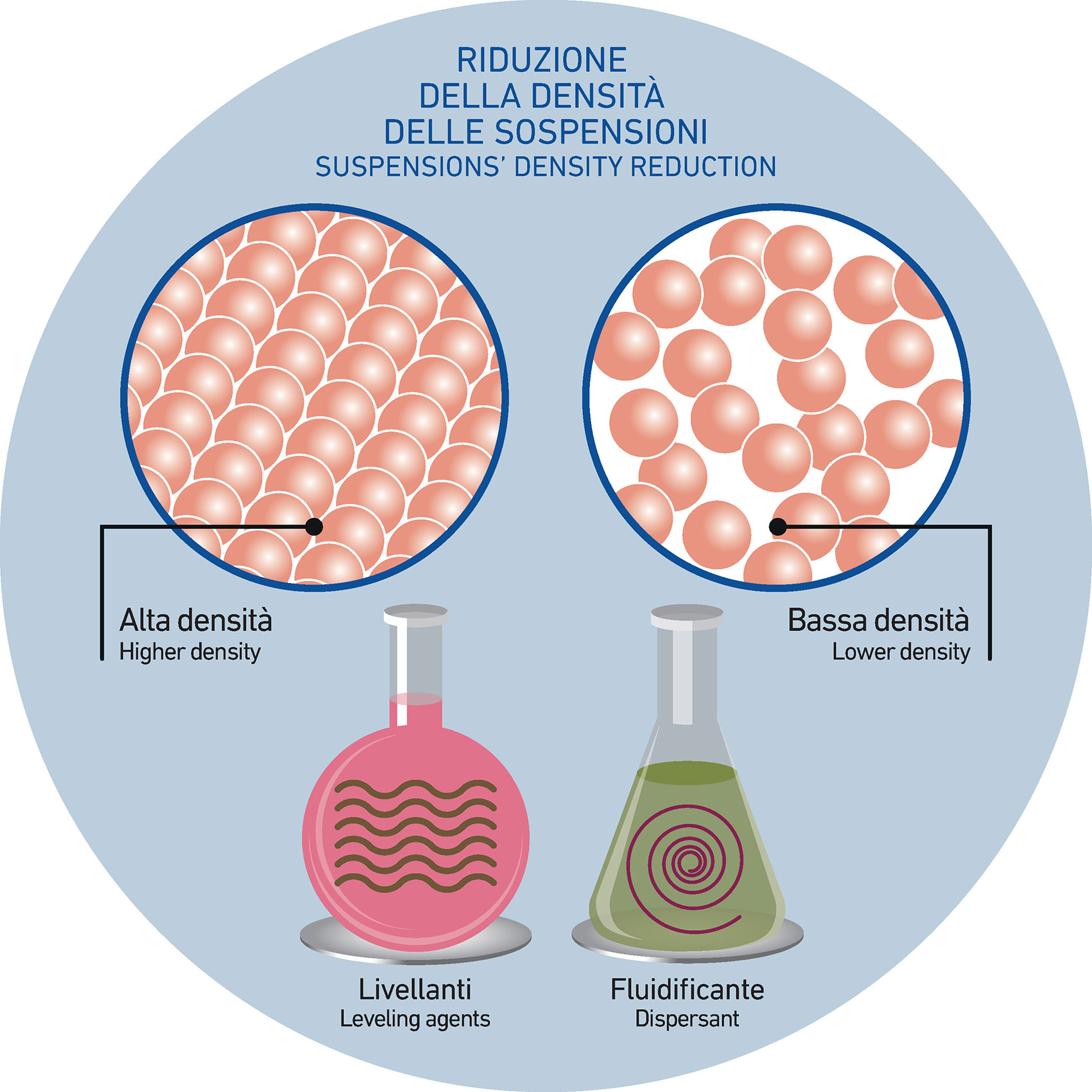 In general, even at this stage of the production process, the use of CHEMICALS FOR GRITS, LEVELING AGENTS, and DISPERSANT positively acts on the density of the slurry and, therefore, on the water-content. What do they do?