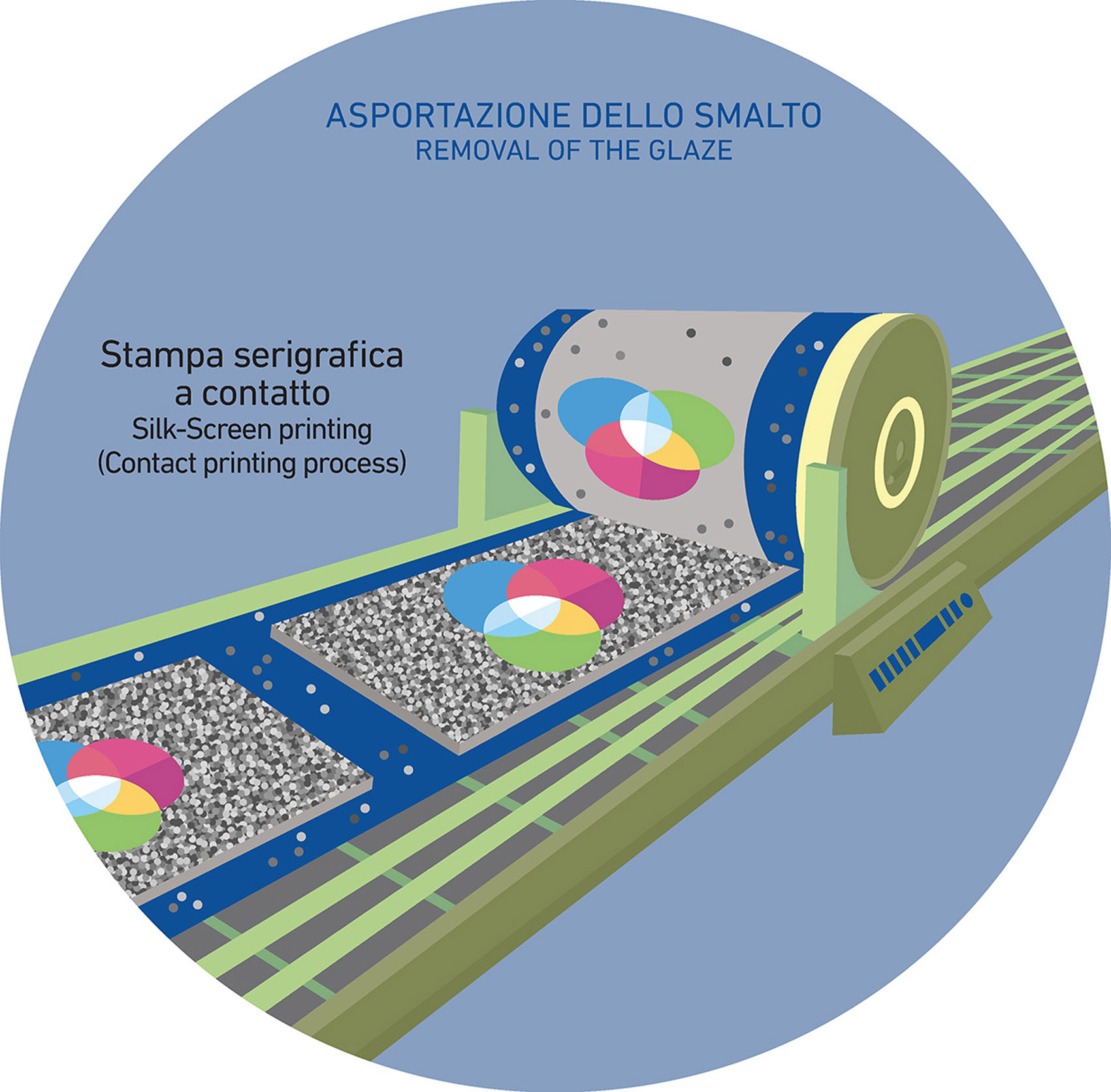 The physical contact between the application machine and the tile used to directly compress the surface, also promoting the removal of a superficial layer of glaze’s particles that usually adhered to the screen mesh or to the roller.