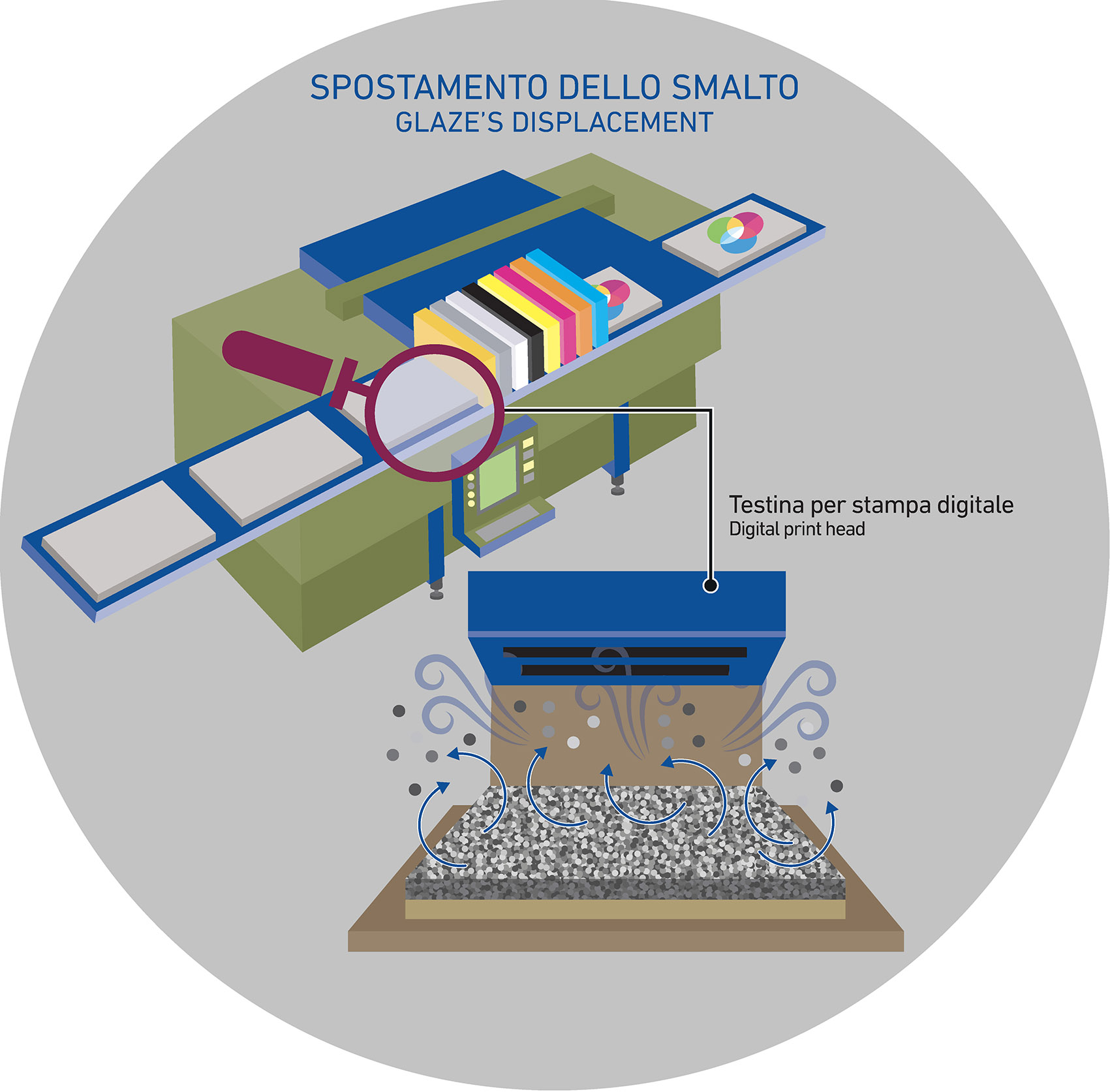 A low cohesive glaze can be removed by the “violence” with which the ink lands or reaches the surface (the speed of discharge ranges from six to seven meters per second), leading to a glaze’s particles displacement, and therefore to their dispersion in the atmosphere, in the tiny space between the raw tile and the bars of the printing machine.
