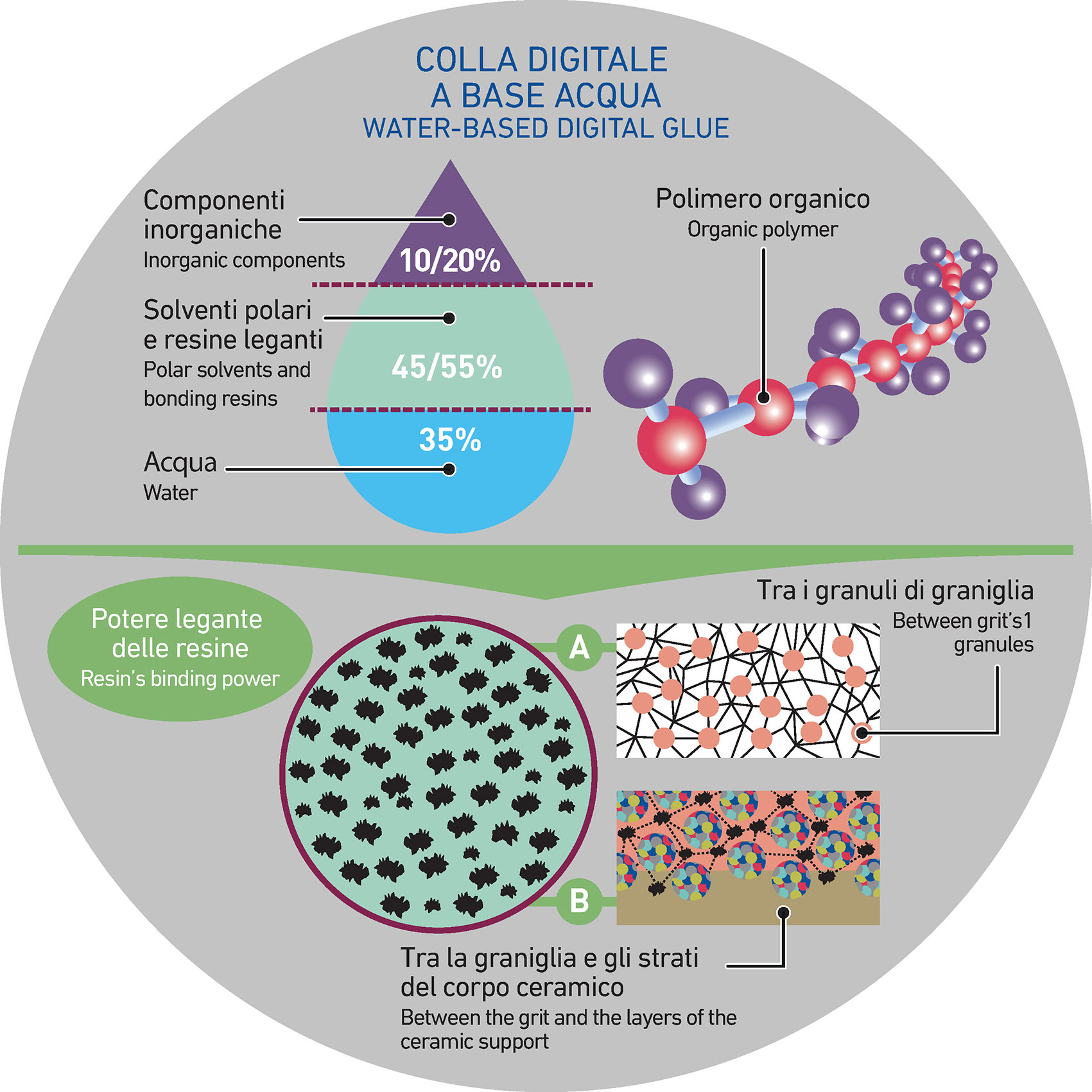 Although the values are constantly monitored and the ceramic district is showing a constant and rigorous attention in containing and complying with the limits laid down by the provisions in force, the research and the development of alternative solutions that can improve producers’ standards and performances currently represent the first goal in the agenda of several companies involved in the field. In this perspective, the replacement of specific products with low-invasive alternatives – which is still today timid and not predominant – seems to be played around the water-based topic. A complex issue that is both in evolution yet inevitable.