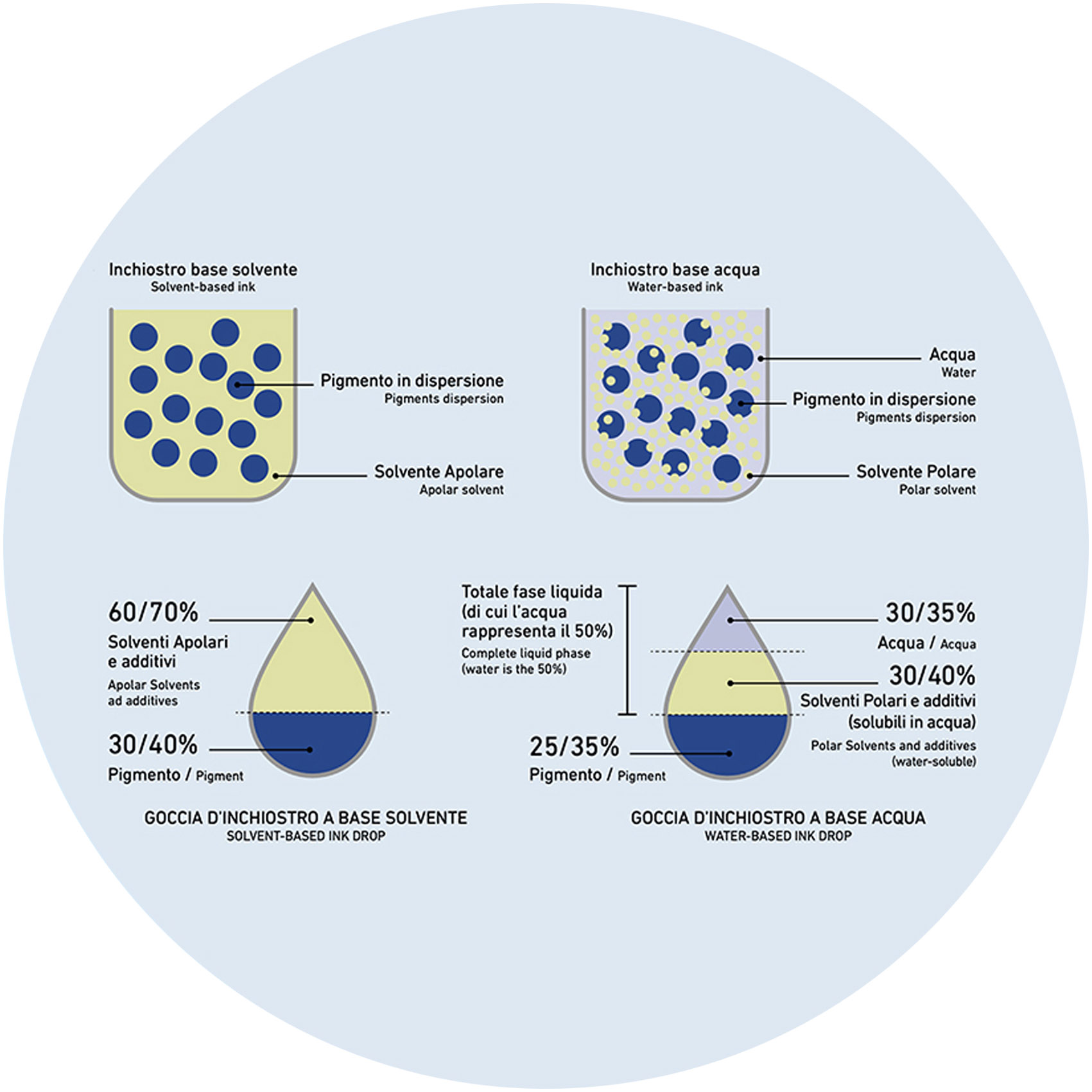 Following here some data about the composition of the main categories of digital inks (solvent based VS water-based) to show the most important difference between the two. Solvent-based digital inks consist of 60/70% of non-polar solvent and chemical plus 30/40%n of pigments, while water-based digital inks consist of 30/40% of polar solvent and chemicals, 25/35% of pigments and 30/35% of water. Speaking about emissions, non-polar solvents are the main responsible for the problem. Since within water-based digital inks these solvents are replaced by polar solvents, the problem is significantly reduced.