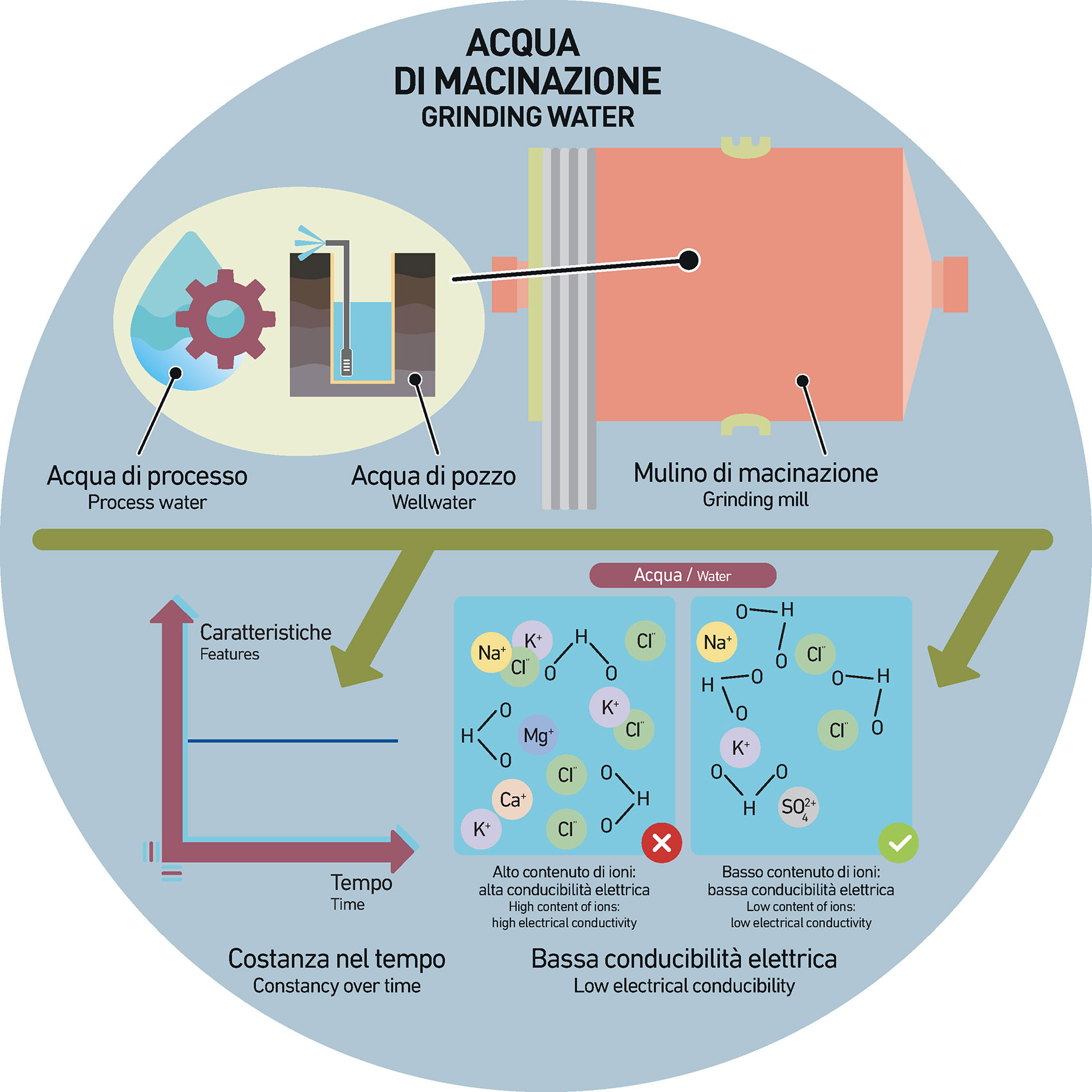 In general, it is important to keep constant the composition and the quality of water over time so as to avoid possible fluctuations in the grinding parameters which would force companies to continuously adapt and modify the production parameters. For this reason, the water must be constantly checked and controlled, especially in terms of pH and electrical conductivity which essentially indicates the amounts of ions (cations and anions).
