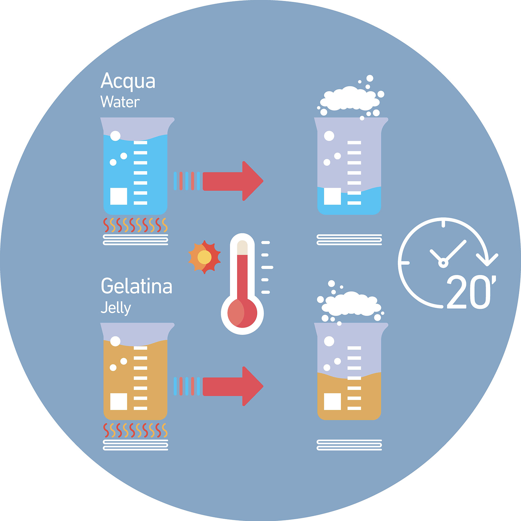 Per meglio spiegare la ragione di queste diverse tempistiche e temperature ci affidiamo a un esempio preso a prestito dal mondo della cucina. Mondo in cui la chimica gioca un ruolo non di poco conto.Se ad esempio scaldiamo contemporaneamente un bicchiere d’acqua e un bicchiere di gelatina, ci accorgiamo che l’acqua contenuta nella gelatina, a parità di tempo, evaporerà più lentamente essendo essa chimicamente legata alla colla di pesce presente all’interno della miscela gelatinosa.