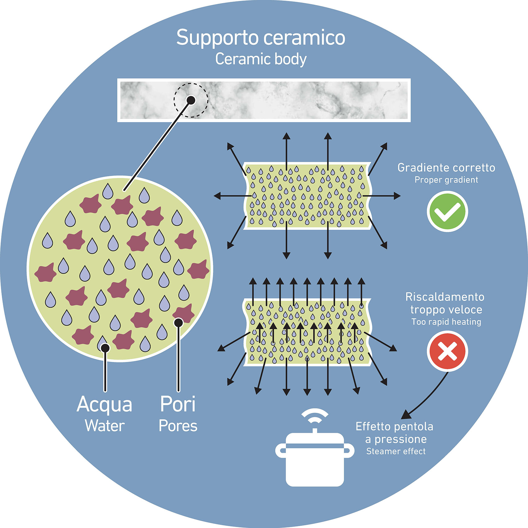 Esso agisce e svolge un ruolo fondamentale sulla corretta modalità di evaporazione dell’acqua. Se il gradiente è lento e costante, l’acqua contenuta all’interno del supporto trova il tempo necessario per migrare ed evaporare in modo corretto e naturale. Se invece l’aumento della temperatura non è costante o eccessivamente rapido ecco che il materiale ceramico rischia di scoppiare.