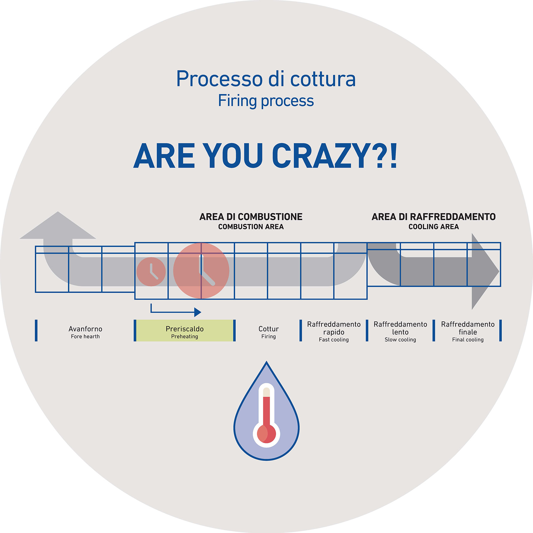Durante il processo di cottura, le piastrelle iniziano a scaldarsi di norma in modo graduale e costante. Parallelamente al processo di riscaldamento s’innesca, com’è ovvio, il processo di evaporazione dell’acqua. Acqua che si trova sia sulla superficie del pezzo ma anche, e soprattutto, all’interno del corpo ceramico.