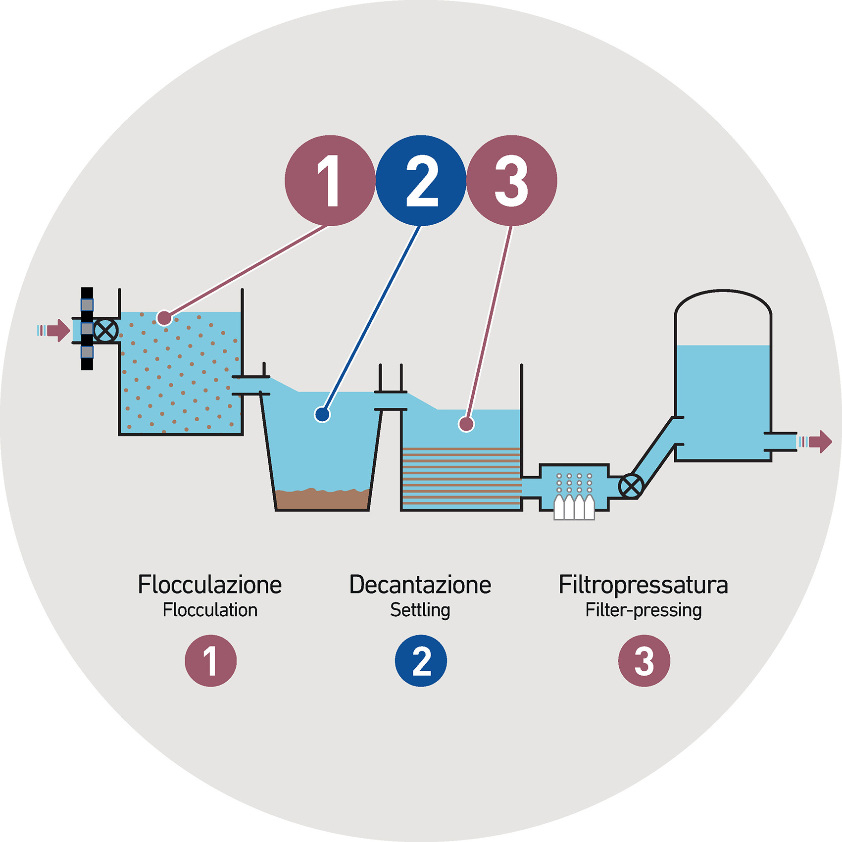 La chiarificazione delle acque è certamente uno di questi. Essa si sviluppa mediante un processo di flocculazione, decantazione e filtro-pressatura delle particelle sospese all’interno dell’acqua.