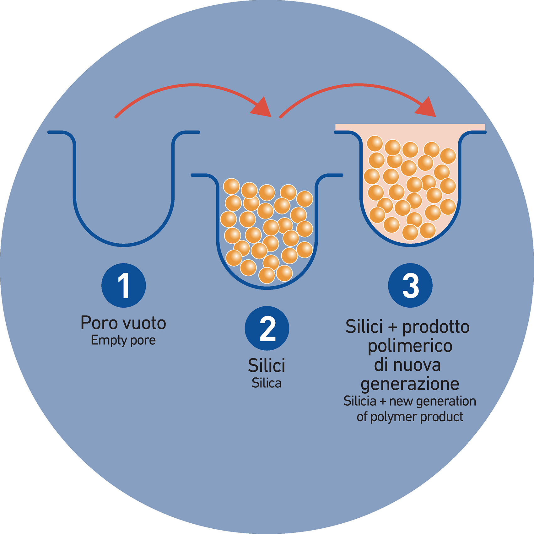 Si tratta di prodotti che hanno la capacità di essere assorbiti e legarsi chimicamente sul reticolo della silice che ha precedentemente sigillato il poro. Una volta applicati, essi vanno ad integrarsi al sistema creando la sigillatura definitiva delle fessure.