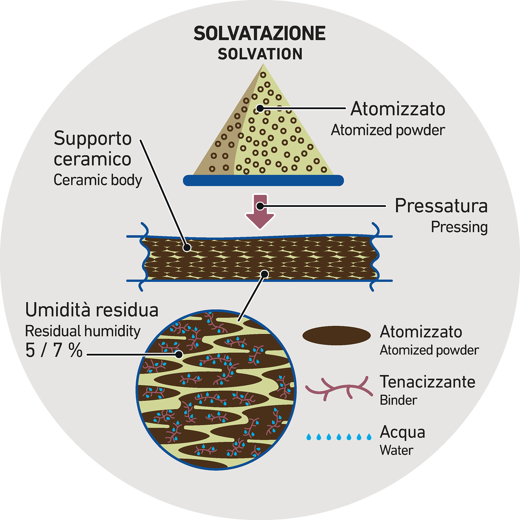 La polvere di argilla così atomizzata – che già contiene il tenacizzante – passa quindi sotto alle presse andando a formare il corpo ceramico crudo, che in questa fase conserva ancora la propria umidità residua.