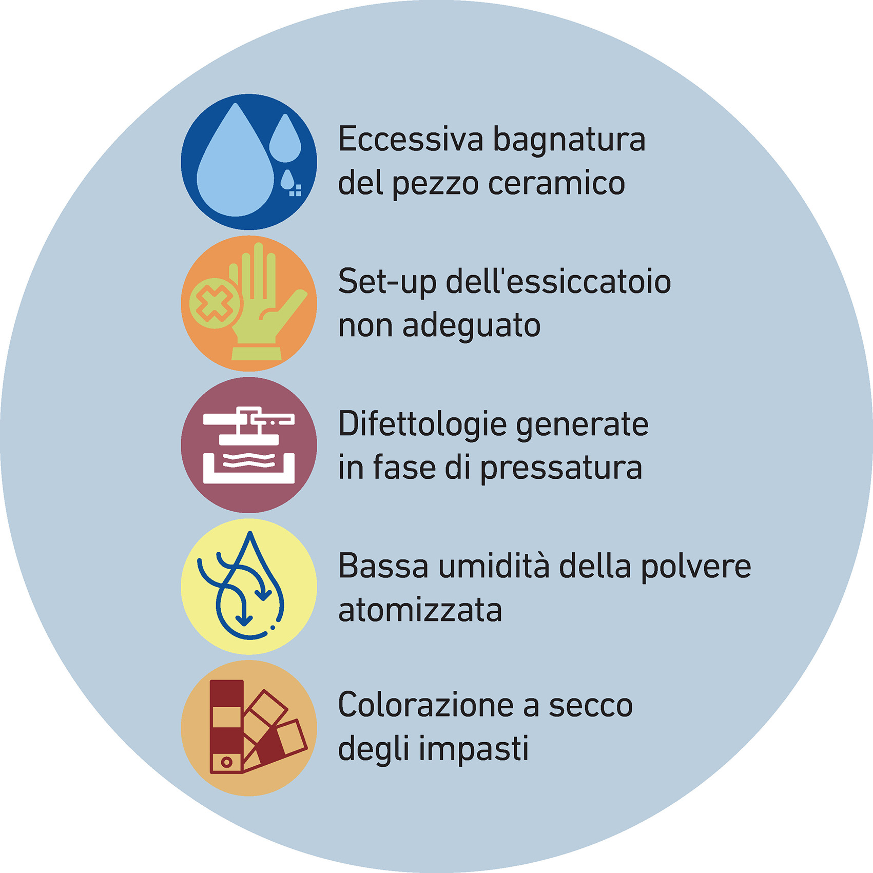 1. Eccessiva bagnatura del pezzo ceramico → Si può intervenire aumentando ad esempio le densità di lavoro degli smalti o più in generale riducendo la quantità di acqua apportata in smalteria