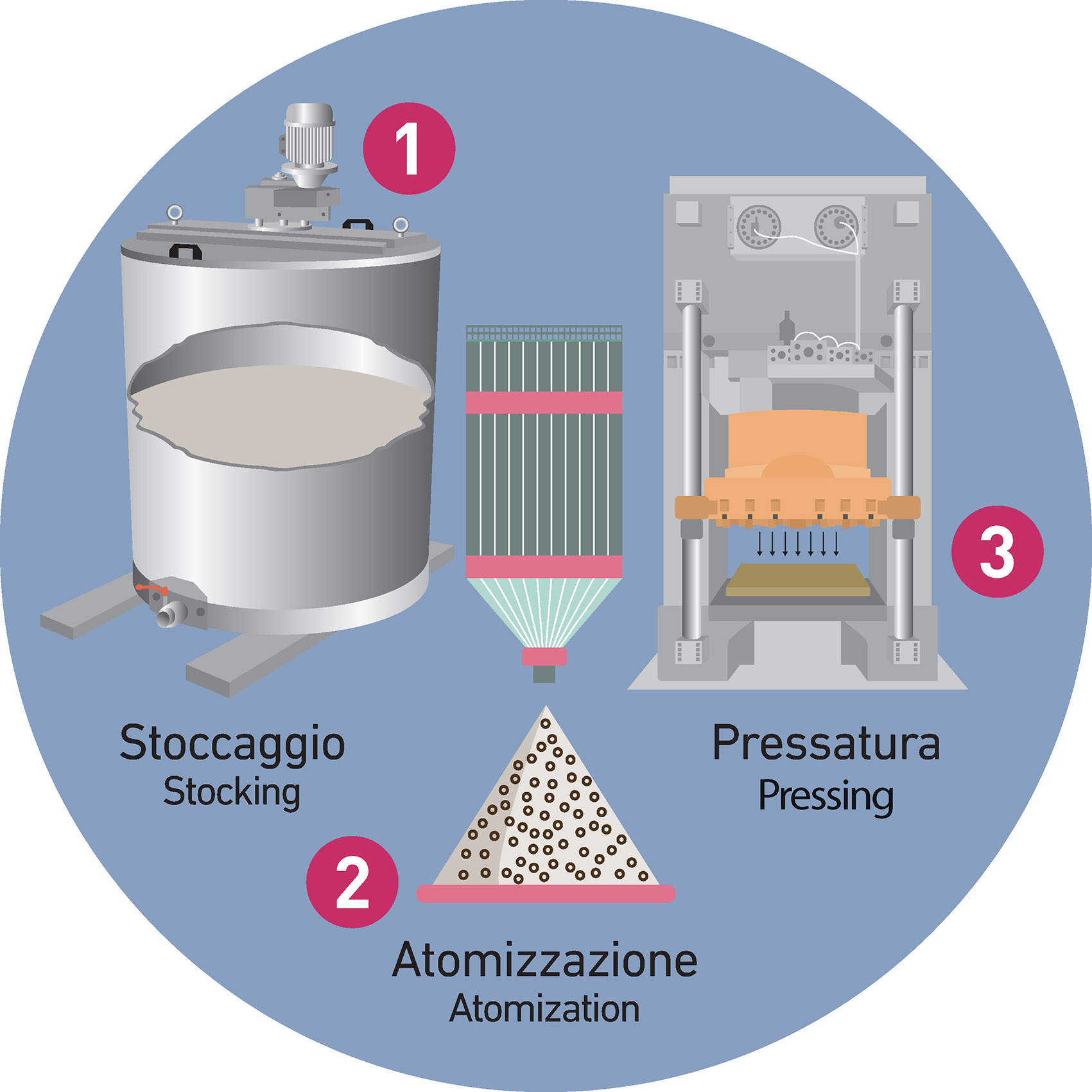 Dopo la fase di stoccaggio – la cui durata può variare in base alle esigenze di ogni singolo produttore – si procede con la fase di atomizzazione per mezzo di spray dryer. Dentro all’atomizzatore la barbottina viene nebulizzata per mezzo di temperature molto elevate, capaci di far evaporare l’acqua in modo rapido e violento. Tale evaporazione “trasforma” le singole gocce di barbottina in minuscole sfere cave il cui insieme forma la polvere atomizzata. Pronta per la pressatura o formatura.