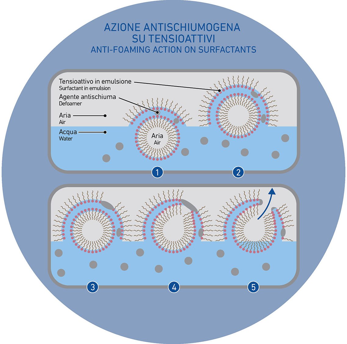 L’interazione prevede lo spostamento o cambiamento dell’equilibrio e della stabilità del sistema: una destabilizzazione che porta allo scoppio delle bolle. Allo stesso modo, tuttavia, è possibile intervenire anche mediante l’uso di prodotti insolubili in acqua e dunque idrofobi. È il caso degli antischiuma che destabilizzano il sistema schiumogeno agendo sulla tensione superficiale, rompendo le code idrofobe del tensioattivo che tiene insieme la bolla sino allo scoppio.