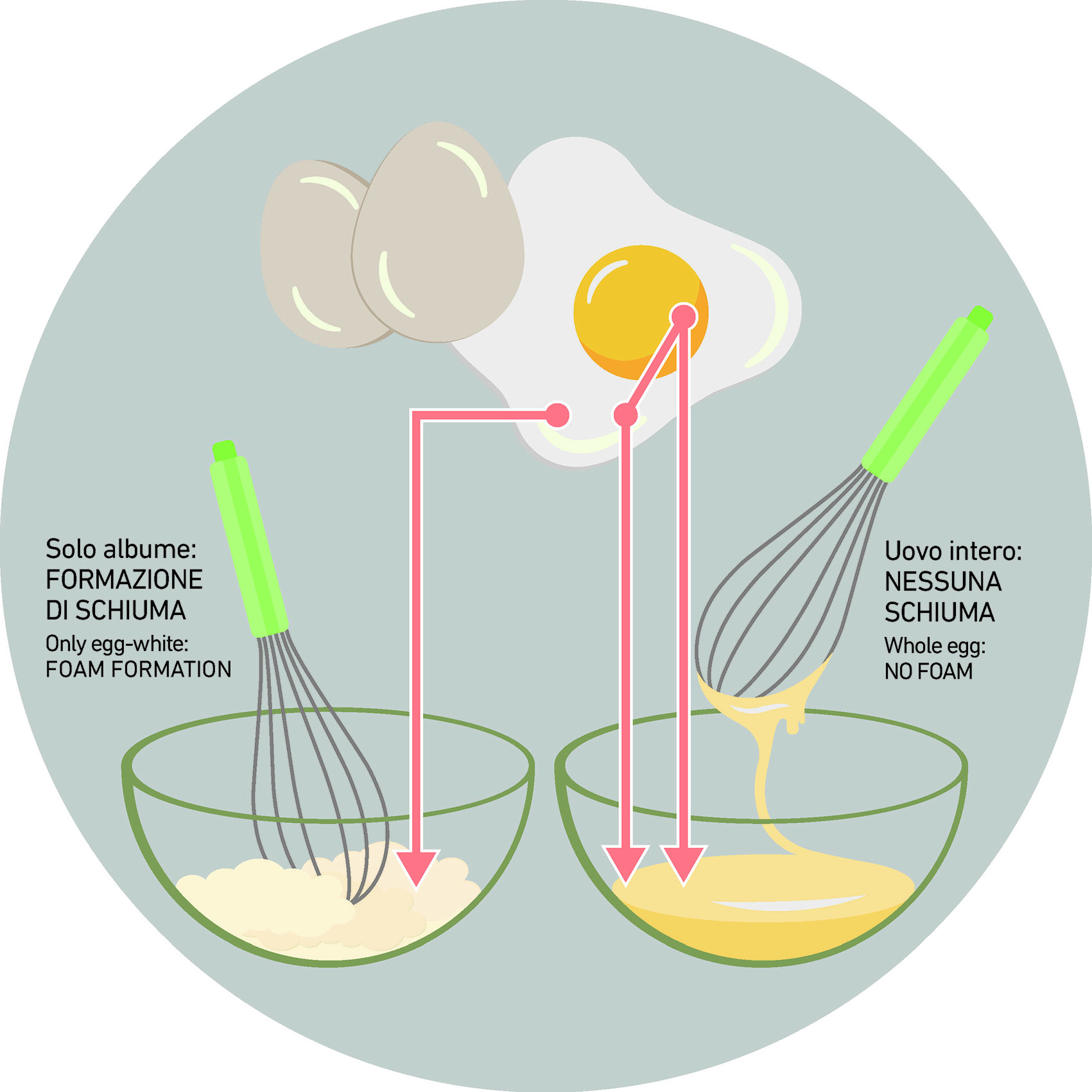 Se procediamo usando solo l’albume (la parte bianca) constateremo la formazione progressiva di schiuma. Se invece contestualmente all’albume utilizziamo anche il tuorlo (la parte rossa) assisteremo alla totale assenza di fenomeni schiumogeni. Perché?