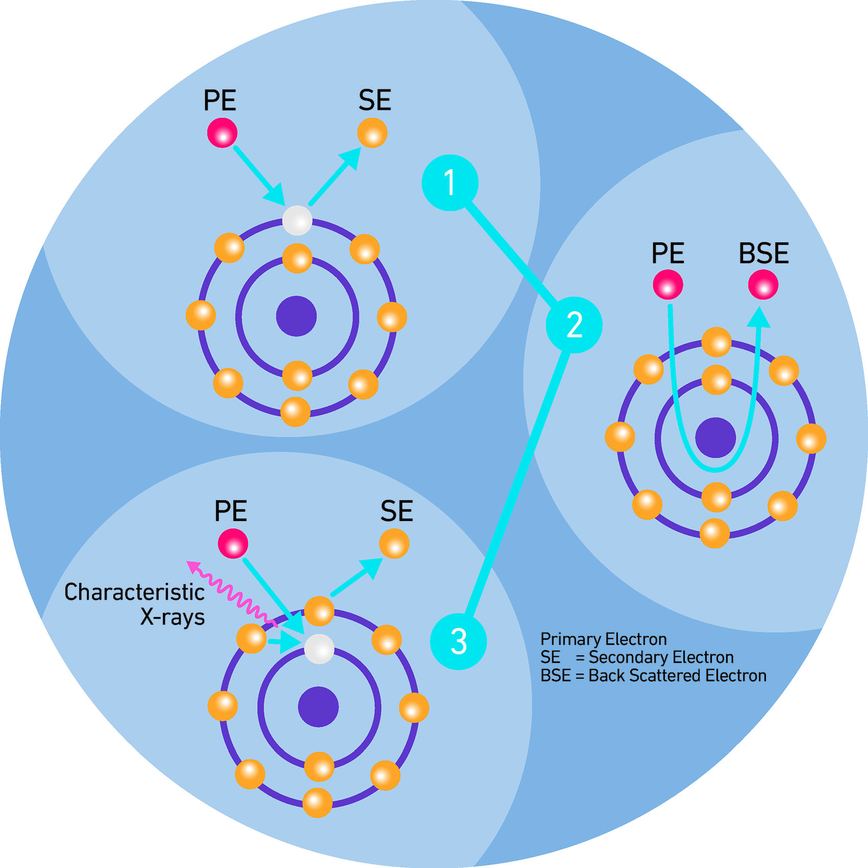 Per semplificare al massimo possiamo dire che gli elettroni che emergendo dal campione consentono di ottenere le informazioni di maggior rilievo sono, in primo luogo, gli elettroni del fascio incidente riflessi elasticamente, i quali mantengono inalterata la propria energia (elettroni primari), ed in secondo luogo gli elettroni scalzati dalla superficie del campione a causa dell’interazione anelastica del fascio elettronico con questa (elettroni secondari). Quando gli elettroni secondari vengono emessi dal campione, questo si troverà in uno stato eccitato ad energia elevata.