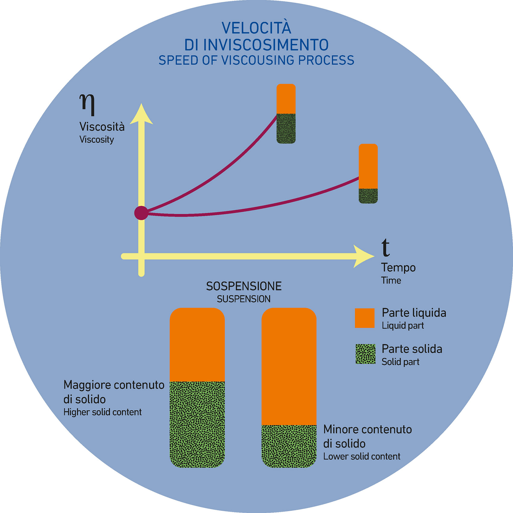 Tuttavia i tempi con i quali la viscosità incrementa saranno decisamente diversi: la sospensione ad alto peso, avendo meno acqua da rilasciare, impiegherà meno tempo rispetto alla sospensione a basso peso, che viceversa necessiterà di tempi superiori per raggiungere lo stesso (ipotetico) livello di viscosità.