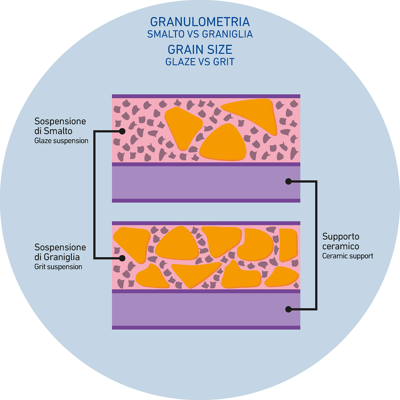 Sospensioni di graniglia e sospensioni di smalto possono differire non solo per la quantità di fritte contenute al loro interno ma anche per la granulometria del particolato che le compone.