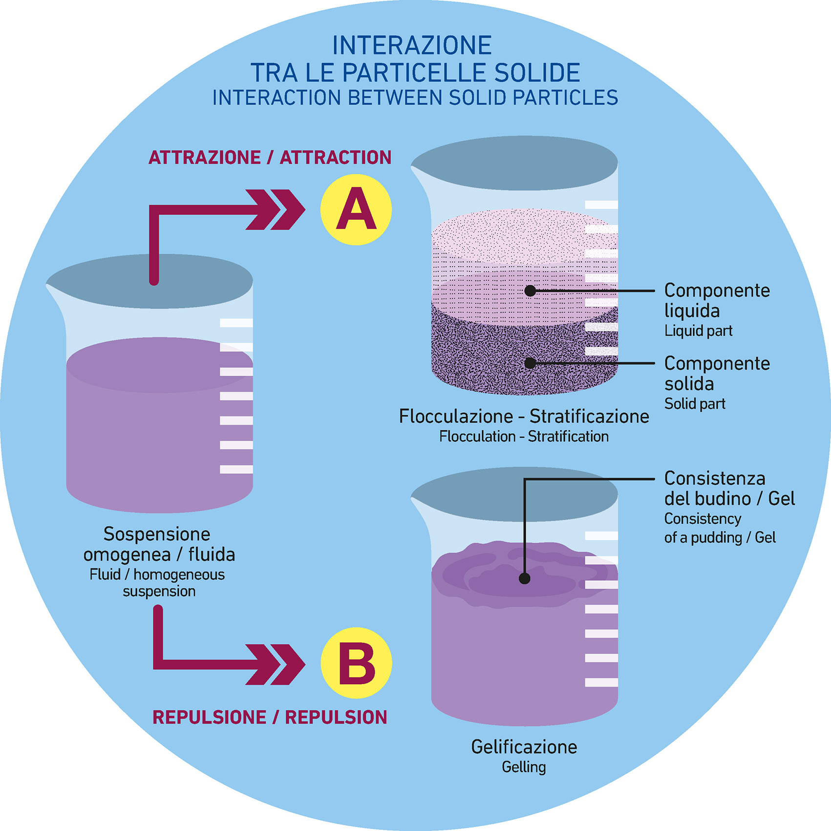 I leganti, infatti, contribuiscono a rendere maggiormente viscosa la parte liquida del sistema e, in funzione di tale azione viscosizzante, sono in grado di contrastare i fenomeni di sedimentazione che potrebbero svilupparsi nel corso del tempo. Sul piano fisico, infatti, l’aumento dei valori di viscosità contrasta maggiormente l’effetto della forza di gravità o, meglio ancora, contribuisce a rallentare il tempo di sedimentazione. Di fatto, il processo di sedimentazione di queste tipologie di sospensioni– se si considerasse un tempo ipoteticamente infinito – è inevitabile e non è semplice da contrastare: si può tuttavia lavorare limitando la probabilità che questo processo prenda piede in fase di lavoro, lungo le linee produttive.